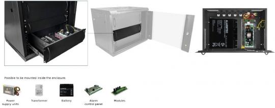Das ARAD3S ist ein universelles 19"-Gehäuse für Sicherheitssysteme beispielsweise von SATEL, DSC, Risco, Paradox und vielen mehr. Alle nötigen Komponenten wie Trafo, Akku, Systemplatinen und viele weitere können in vorgefertigte Aufnahmen installiert werden. Das ARAD3S ist sabotageüberwacht gegen Öffnen des Deckels.