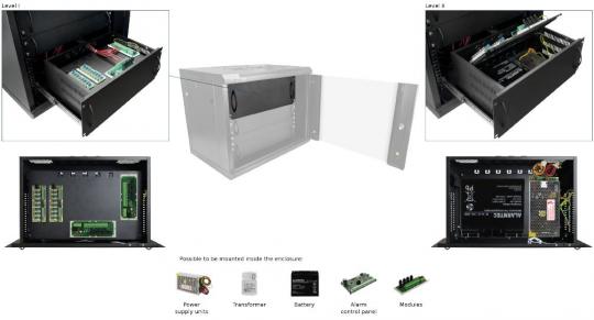 Das ARAD4S ist ein universelles 19"-Gehäuse für Sicherheitssysteme beispielsweise von SATEL, DSC, Risco, Paradox und vielen mehr. Alle nötigen Komponenten wie Trafo, Akku, Systemplatinen und viele weitere können in vorgefertigte Aufnahmen installiert werden. Zwei Installationsebenen bieten Platz für viele Platinen und Module. Das ARAD4S ist sabotageüberwacht gegen Öffnen des Deckels.