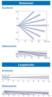 21 x 21 m, 85° Weitwinkel oder 45 x 2,4 m Langstrecke
