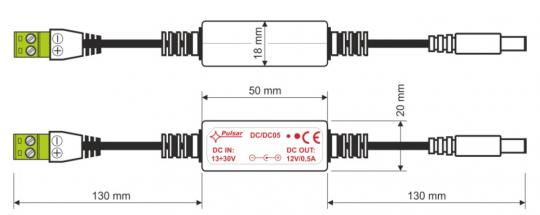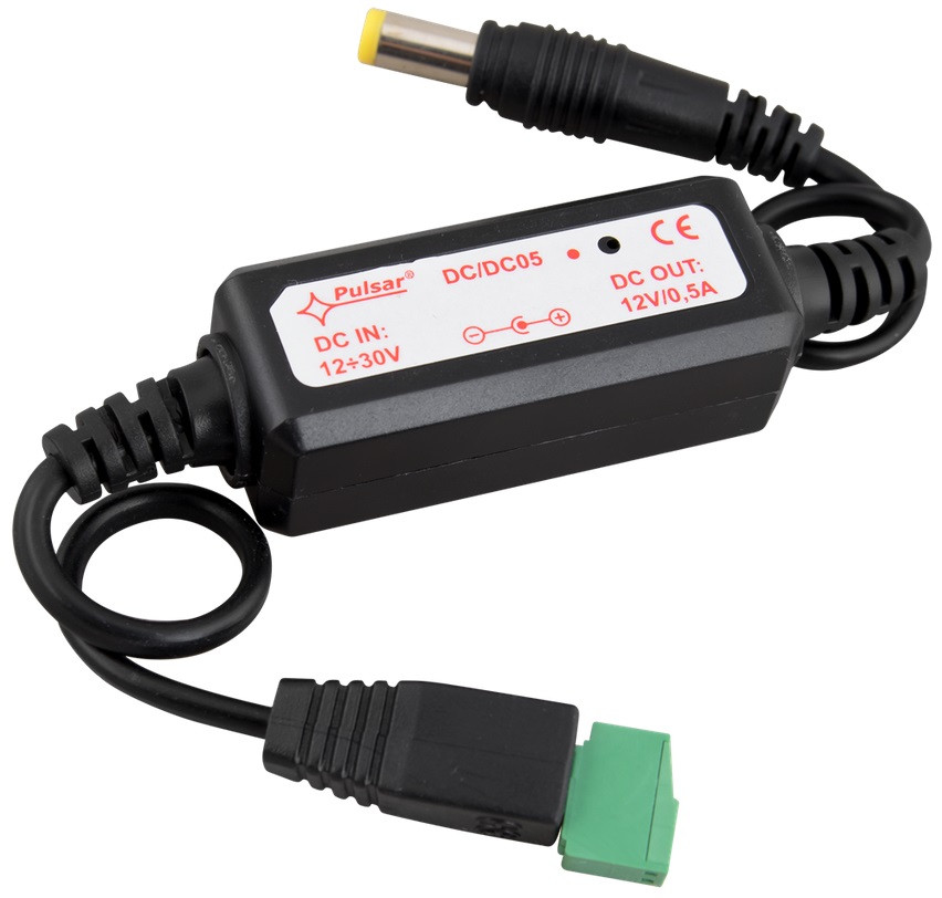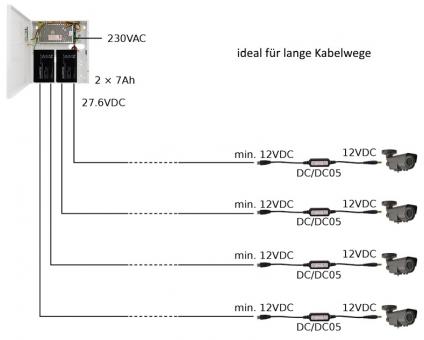 Der Konverter DC/DC05 wird als Spannungsregulierer am Ende einer längeren 12VDC-Zuleitung eingesetzt. Um den Spannungsabfall auf längeren Leitungswegen zu kompensieren wird die Speisespannung erhöht und am Verbraucher wieder auf 12VDC abgesenkt. So erhalten Sie auch über längere Zuleitungen eine stabile Speisespannung für die Endgeräte. Der DC/DC05 ist äusserst kompakt und ist eingangsseitig gegen Verpolung gesichert.