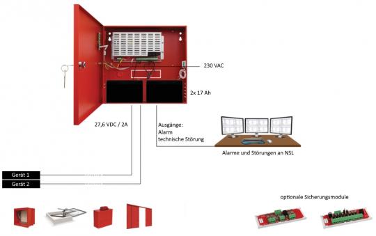 - Störungsausgänge für Akkuüberwachung, Netzspannung, Systemstörung