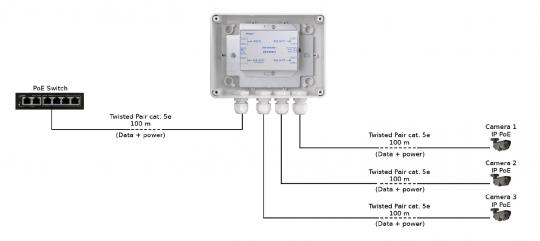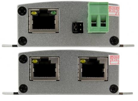 Der PoE-Extender EXT-POE4H verlängert die Reichweite einer Passiv-PoE-Verbindung um zusätzliche 100 Meter. Er kann wahlweise über den PoE-Eingang spannungsversorgt werden, oder mit einer externen 48V-Versorgung als Injektor betrieben werden. Die Auswahl wird über einen Jumper getätigt. Die Gesamtstromabgabe liegt bei 0,4A. Der Extender verfügt sowohl über eine Überlastungs- als auch eine Kurzschlusssicherung.