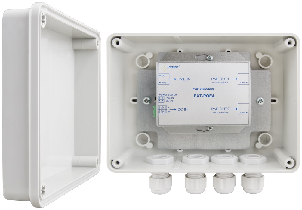 Der EXT-POE4H wird vorinstalliert in einem staub- und wassergeschützten ABS-Gehäuse (IP56) geliefert. Passende Verschraubungen und Installationsmaterial ist im Lieferumfang enthalten. Zur Mastmontage können die passenden Mastschellensets OZB2 verwendet werden.