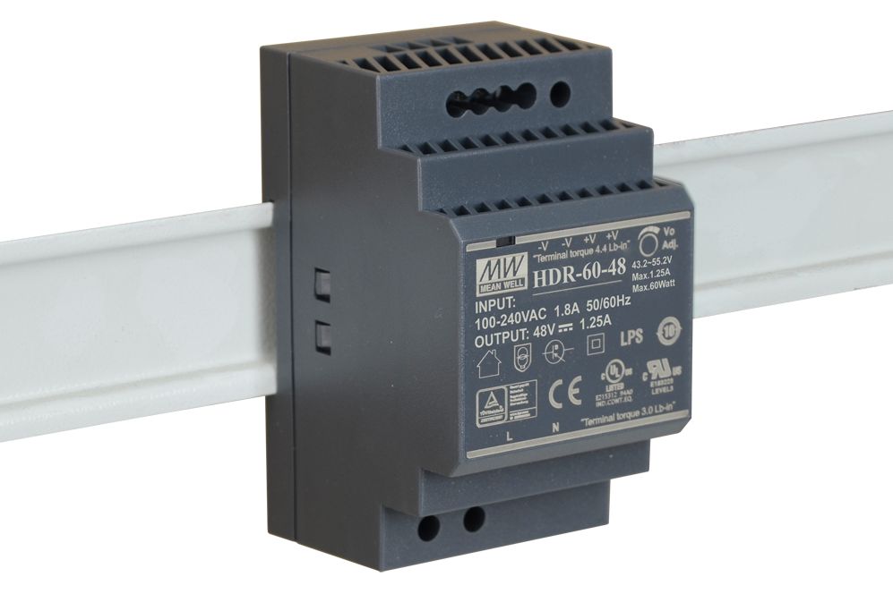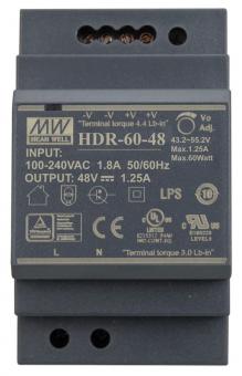 Das Meanwell HDR-60-48 ist ein universell einsetzbares 48 V DC Schaltnetzteil für die Installation an einer Hutschiene (TS-35/7.5 oder 15). Es verfügt über einen Schutz gegen Kurzschluss, Überlast- und Überspannungsschäden sowie eine LED zur Anzeige der Betriebsbereitschaft.