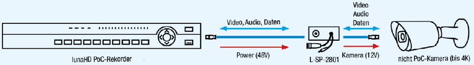 Die Spannungseinspeisung auf der Gegenseite erfolgt über einen PoC-fähigen LUNA Rekorder. Das Gehäuse ist für eine Montage auf Hutschiene geeignet.