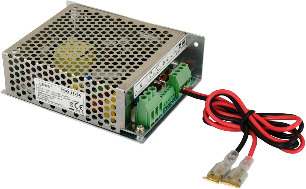 Das Netzteil PSG2-12V3A ist ein universell einsetzbares, GRADE-2 konformes und gepuffertes 3A Impulsnetzteil mit einem Akkuladestrom von 0,5A/1A. Aufgrund der kompakten Abmessungen passt es hervorragend in kleine Gehäuse. Das Netzteil verfügt über Kurzschluss-, Überspannungs- sowie Überlastschutz und Service-Ausgänge bei: AC-Netzstörung und Akkumulatorausfall. Es wird ein automatischer Akku-Test alle 5 Minuten durchgeführt.