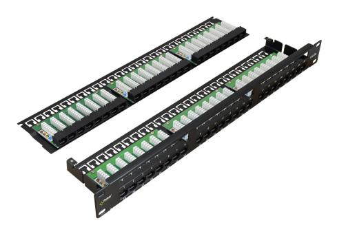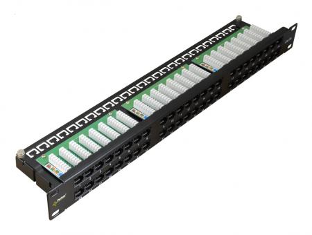 Das RP-U48V5 bildet den Endabschluss in der 19"-Technik für strukturierte Verkabelung. Es stellt 48 Ports für UTP/Cat 5e auf nur 1HE zur Verfügung. Die rückseitig aufgelegten Kabel können sauber auf der Führungs- und Entlastungsschiene fixiert werden, die farbig markierten LSA-Klemmen erleichtern das Anlegen. Die Frontanschlüsse sind fortlaufend und gut leserlich nummeriert. Die 4-Punkt-Befestigung garantiert hohe Haltbarkeit. Das RP-U48V5 wird komplett mit Schrauben, Kabelbinder und Topfmuttern geliefert.