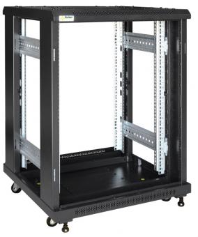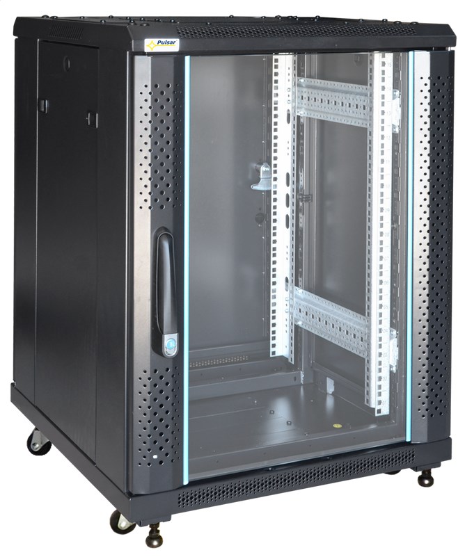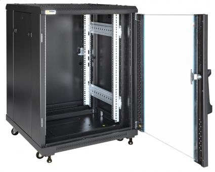 Der fahrbare 19"-Schrank RS1566 bietet 15 Höheneinheiten für CCTV-Verteiler, Patchfelder und 19"-Infrastruktur jeder Art. Er lässt sich bequem über die Schwerlastrollen zum Montageort transportieren und kann über die beiliegenden Stellfüße fixiert werden. Die hochwertige Verarbeitung und ein durchdachtes Installationsmanagement für Montagestege, Kabelhalter und Rack-Technik erleichtern die Fertigung, Erweiterung und Wartung der Systeme. Die Fronttür besteht aus 5mm gehärtetem Glas. Durch den justierbaren Abstand der vorderen und hinteren Schienen ist der Schrank an die unterschiedlichste Technik anpassbar. Die geringe Tiefe ermöglicht die Installation bei beengten Räumlichkeiten. Montagemöglichkeiten für Belüftungssysteme (RAWP und andere) sowie spezielle Belüftungsbleche an Vorder-, Unter- und Oberseite schützen vor Stauhitze und erleichtern das Temperaturmanagement.