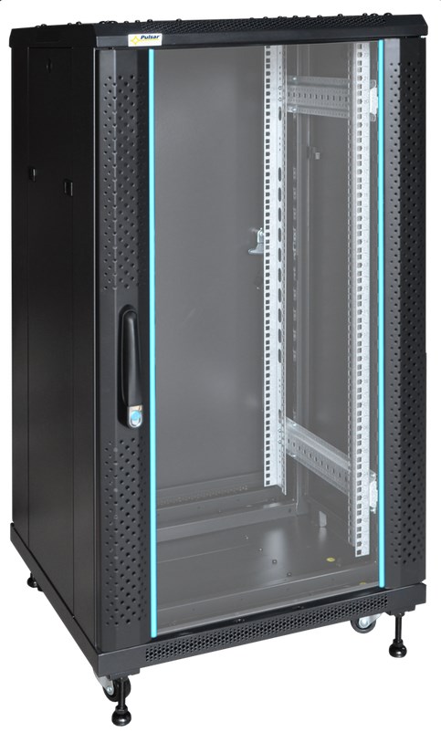 Der fahrbare 19"-Schrank RS2266 bietet 22 Höheneinheiten für CCTV-Verteiler, Patchfelder und 19"-Infrastruktur jeder Art. Er lässt sich bequem über die Schwerlastrollen zum Montageort transportieren und kann über die beiliegenden Stellfüße fixiert werden. Die hochwertige Verarbeitung und ein durchdachtes Installationsmanagement für Montagestege, Kabelhalter und Rack-Technik erleichtern die Fertigung, Erweiterung und Wartung der Systeme. Die Fronttür besteht aus 5mm gehärtetem Glas. Durch den justierbaren Abstand der vorderen und hinteren Schienen ist der Schrank an die unterschiedlichste Technik anpassbar. Die geringe Tiefe ermöglicht die Installation bei beengten Räumlichkeiten. Montagemöglichkeiten für Belüftungssysteme (RAWP und andere) sowie spezielle Belüftungsbleche an Vorder-, Unter- und Oberseite schützen vor Stauhitze und erleichtern das Temperaturmanagement.