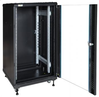 Der fahrbare 19"-Schrank ZRS2266 bietet 22 Höheneinheiten für CCTV-Verteiler, Patchfelder und 19"-Infrastruktur jeder Art. Er lässt sich bequem über die Schwerlastrollen zum Montageort transportieren und kann über die beiliegenden Stellfüße fixiert werden. Die hochwertige Verarbeitung und ein durchdachtes Installationsmanagement für Montagestege, Kabelhalter und Rack-Technik erleichtern die Fertigung, Erweiterung und Wartung der Systeme. Die Fronttür besteht aus 5mm gehärtetem Glas. Durch den justierbaren Abstand der vorderen und hinteren Schienen ist der Schrank an die unterschiedlichste Technik anpassbar. Die geringe Tiefe ermöglicht die Installation bei beengten Räumlichkeiten. Montagemöglichkeiten für Belüftungssysteme (RAWP und andere) sowie spezielle Belüftungsbleche an Vorder-, Unter- und Oberseite schützen vor Stauhitze und erleichtern das Temperaturmanagement.
