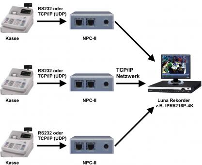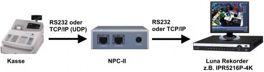 Der Protokollkonverter NPC-II dient dabei als Schnittstelle und bereitet die Daten von unterschiedlichsten Systemen für eine Weiterverarbeitung am LUNA Rekorder auf. Der Konverter ist mit einer Vielzahl an Kassen, Wiegesystemen, Geldautomaten und Barcodescannern kompatibel. Der Datenempfang wie auch das Senden kann dabei sowohl über die serielle Schnittstelle des Gerätes als auch über das Netzwerk (TCP/IP) erfolgen.