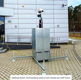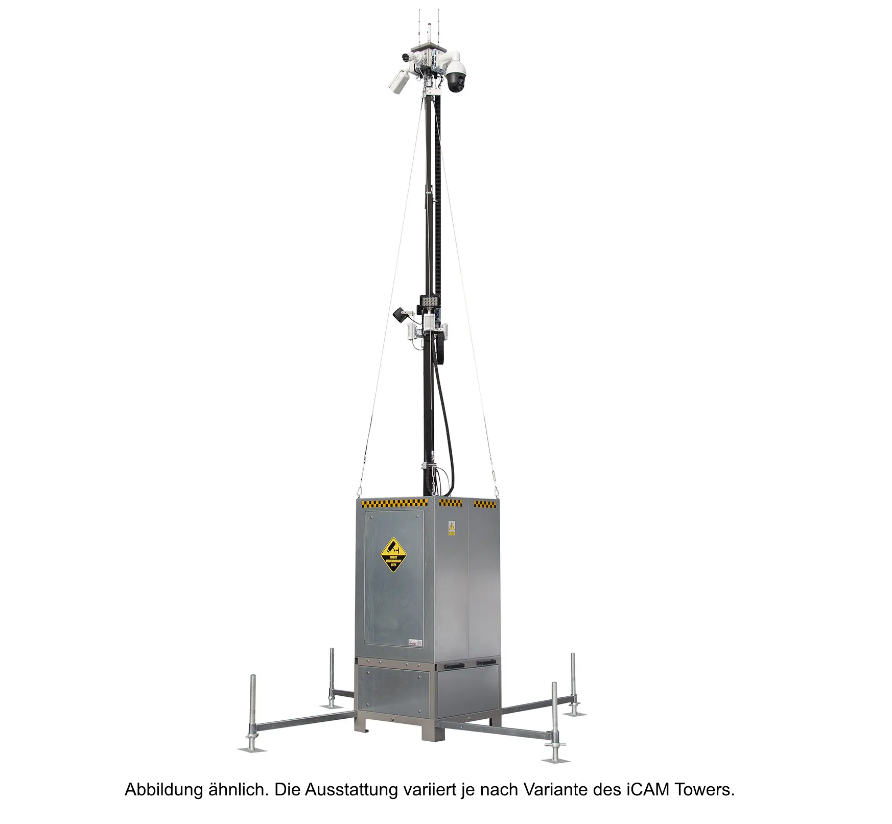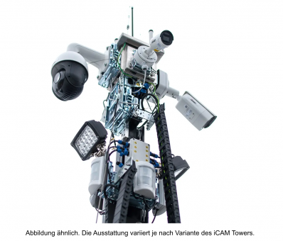 Übertragung der Videobilder und Kamerasteuerung verfügt der iCAM Tower über ein LTE Modem mit zwei Simslots (Redundanz). Über diese Verbindung können die Videodaten bei Bedarf auch zusätzlich an ein weiteres Aufnahmegerät übertragen werden. Für den lokalen Zugriff steht darüber hinaus eine W-Lan Verbindung bereit.