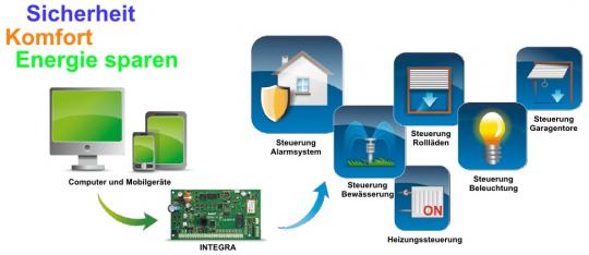 Die zukunftssichere und schnelle Anbindung über TCP/IP wird über das Ethernetmodul ETHM-1 PLUS (DE) realisiert. Es ermöglicht passwortgeschützte Fernzugriffe, Aufschaltungen sowie Bedienung über die Visualisierungssoftware GuardX (im Lieferumfang). Es kann auch jederzeit der Zustand jeder Meldegruppe live dargestellt werden (ähnlich eines Gadgets der Windows-Sidebar). Desweiteren sind eine Vielzahl von Apps für Mobiltelefone oder Tablet-PCs verfügbar (iPhone, Android, Windows Mobile, ...), über die ein Fernzugriff zur Steuerung oder Zustandskontrolle möglich sind. Beim Einsatz in Verbindung mit einer INTEGRA-PLUS-Zentrale besteht die Möglichkeit per E-Mail über Ereignisse informiert zu werden.