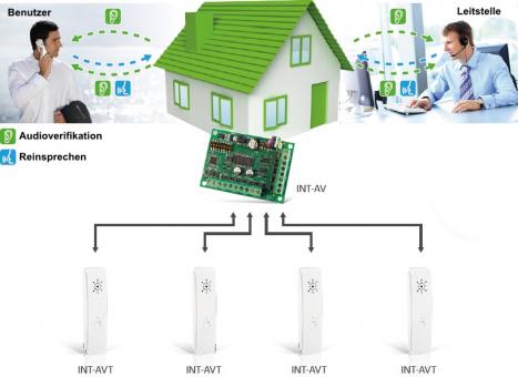 Die Mikrofon-/Lautsprechereinheit INT-AVT ist eine Ergänzung des Listen-in Moduls INT-AV. Sie ist mit einem Lautsprecher und einem Mikrofon ausgestattet. Dies ermöglicht die bidirektionale Sprachkommunikation zwischen dem Bediener der Notrufleitstelle und den Personen aus dem geschützten Objekt. Ebenso ist das kennwortgeschützte Reinhören und Reinsprechen für Benutzer möglich. Bis zu vier INT-AVT können über das INT-AV-Modul verwaltet werden.