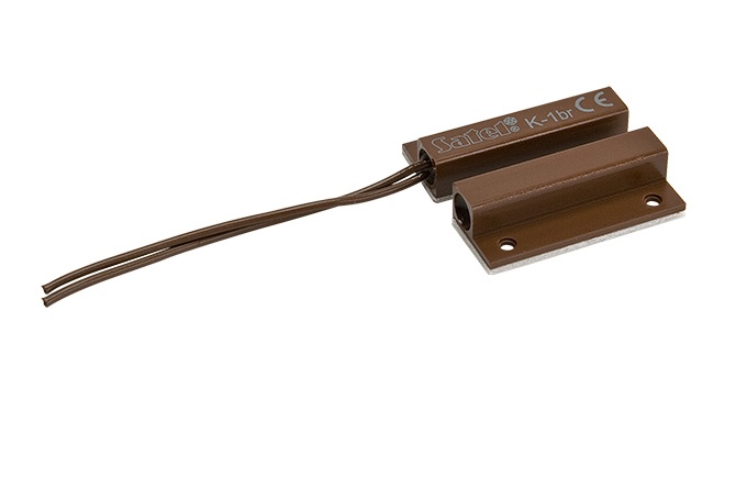 Kleiner, brauner Aufbau-Magnetkontakt mit vergossenem Reedschalter und Magnet. Die Montage erfolgt über Anschrauben oder Ankleben der seitlichen Laschen. Der K-1 ist auch in weiß erhältlich. Der Magnetkontakt kann überall dort angewendet werden, wo Türen, Fenster oder andere bewegliche Elemente überwacht werden müssen, z.B. zum Schutz oder als Zutrittskontrolle zu bestimmten Räumen, Anlagen oder in Automatiksystemen etc.