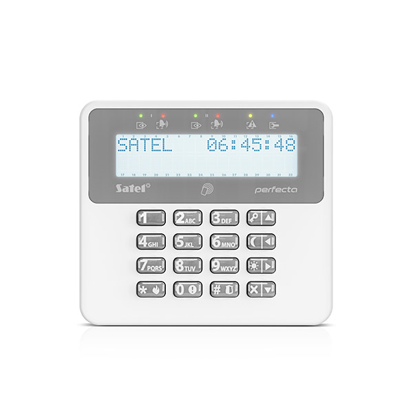 Große Tasten, gut lesbares LCD-Display und helle LEDs erleichtern die Bedienung und die Zustandsabfrage für alle Benutzer. Zusätzlich zu den Standardfunktionen können die verschiedenen Scharfschaltmodi (Tag-scharf, Nacht-scharf, Scharf abwesend) sowie Notrufe (Feuer, Panik, Medizinische Hilfe) bequem über Sondertasten aktiviert werden.