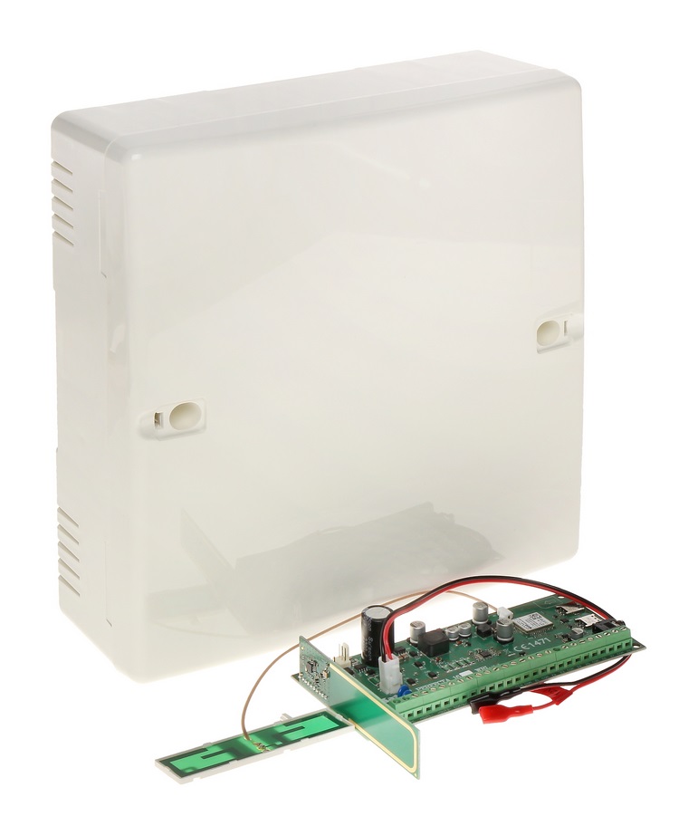 Das PERFECTA-16 WRL SET besteht aus der Zentralenplatine, der Antenne ANT-GSM-I, einem Transformater 40VA und dem Gehäuse OPU-4P.