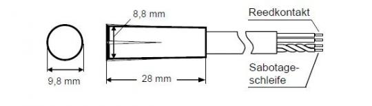Kleiner Einbau-Magnetkontakt mit vergossenem Reedschalter und Magnet und integrierter Sabotageschleife. Die Montage erfolgt über Einstecken und Verkleben in eine Bohrung. Der Magnetkontakt kann überall dort angewendet werden, wo Türen, Fenster oder andere bewegliche Elemente überwacht werden müssen, z.B. zum Schutz oder als Zutrittskontrolle zu bestimmten Räumen, Anlagen oder in Automatiksystemen etc.