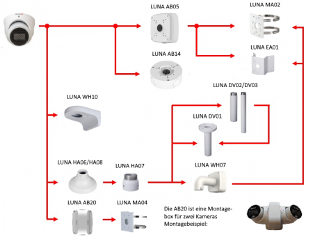 Zugriff über Netzwerk/Internet: lunaCMS (Windows-PC), LunaViewer (App für Android und iPhone) - alle Clientprogramme sind kostenfreiMontageoptionen: