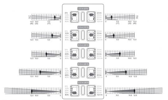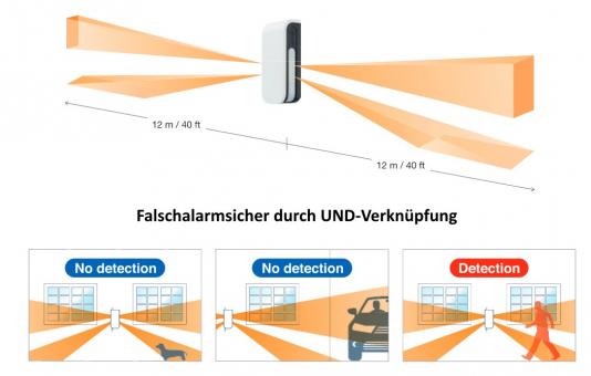 Vier Pyroelemente sorgen für eine wirksame Vermeidung von Falschalarmen. So werden z. B. Mäuse, Katzen oder kleine Hunde im unteren Erfassungsbereich als nicht alarmrelevant ausgeblendet. Der Erfassungsbereich beträgt max. 24 Meter (je 12m nach links und nach rechts. Die Reichweite und Empfindlichkeit kann in fünf Stufen individuell konfiguriert werden. Auch kann ein getrenntes Alarmsignal für die linke und die rechte Seite ausgegeben werden.