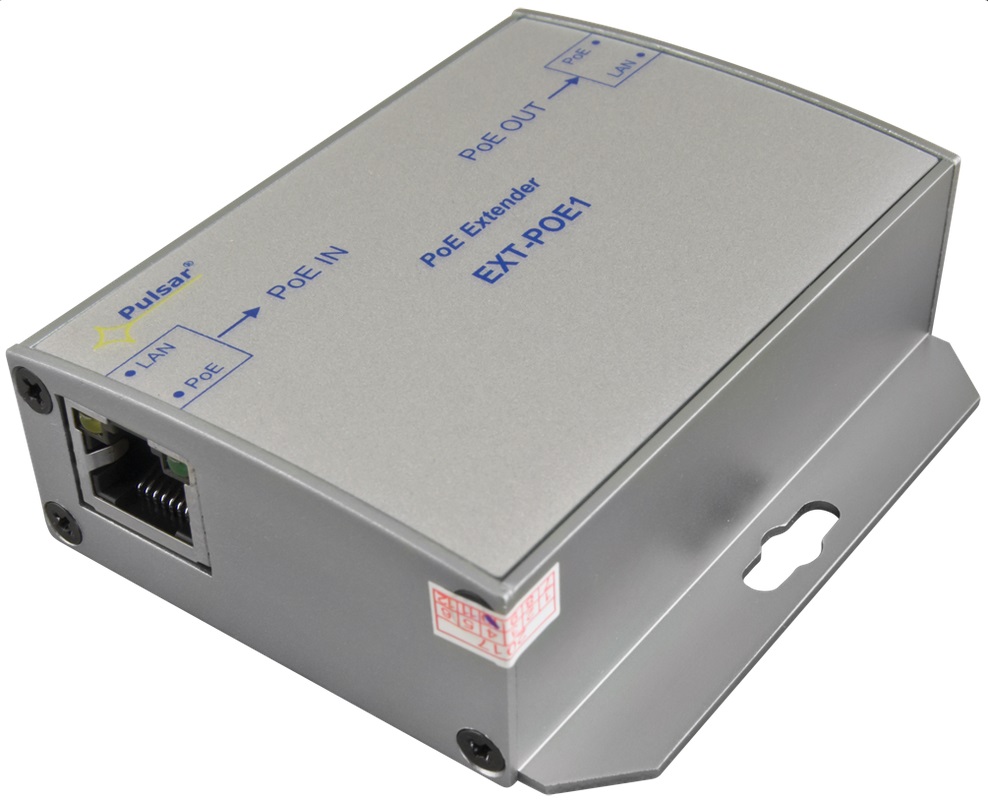 Der PoE-Extender EXT-POE1 verlängert die Reichweite einer PoE-Verbindung um zusätzliche 100 Meter. Der Ausgang ist konform zum PoE-Standard IEEE 802.3af und versorgt Endgeräte mit bis zu 15,4W. Der Extender verfügt sowohl über eine Überlastungs- als auch eine Kurzschlusssicherung. Der EXT-POE1 benötigt kein externes Netzteil, die Versorgung erfolgt direkt über den PoE-Eingang.