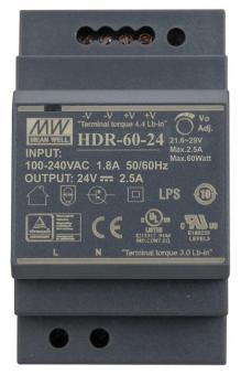 Das Meanwell HDR-60-24 ist ein universell einsetzbares 24 VDC Schaltnetzteil für die Installation an einer Hutschiene (TS-35/7.5 oder 15). Es verfügt über einen Schutz gegen Kurzschluss, Überlast- und Überspannungsschäden sowie eine LED zur Anzeige der Betriebsbereitschaft.