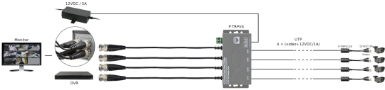 Der P-TRPV4 ist ein 2-Draht Empfänger für die passive Übertragung eines HD-Signals über Patchkabel (UTP Cat 5e/6/7, RJ45 Anschlüsse).