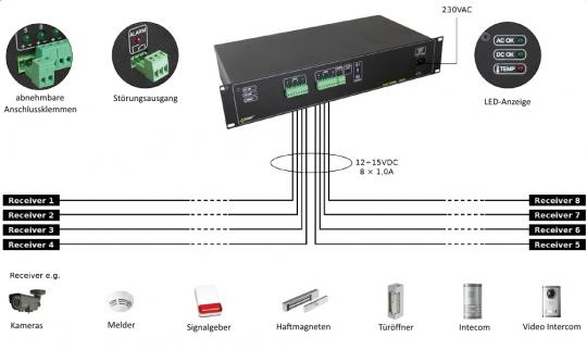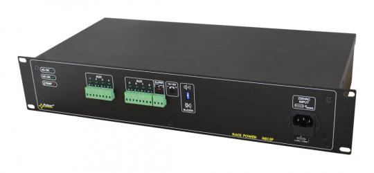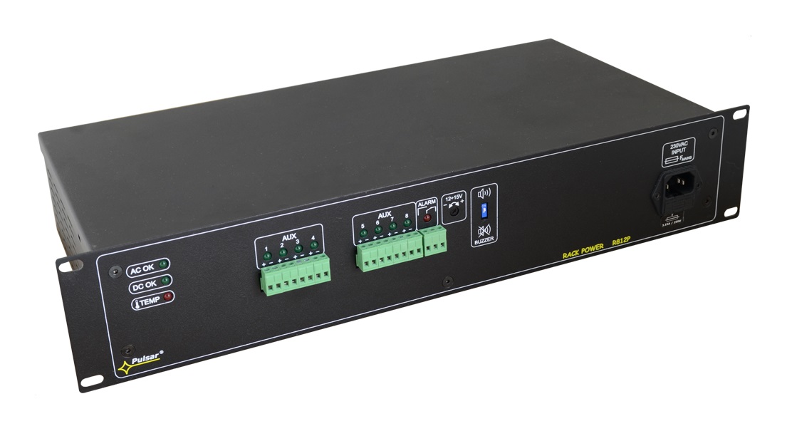 Das R812P ist ein 8-Kanal-Netzteil in 19"-Technik mit zwei HE. Es kann beispielsweise für 8 HD-Kameras, oder andere 12VDC-Verbraucher wie Melder, Türöffner, Intercom-Systeme und vieles mehr verwendet werden. Abnehmbare Anschlussklemmen erleichtern die Installation. Jeder Kanal ist mit einer eigenen, selbstrücksetzenden 1,5A-Sicherung ausgestattet. Zusätzlich verfügt das R812P über optische und akustische Diagnoseanzeigen und ist gegen Kurzschluß und Überspannung gesichert. Aktive Belüftung und eine Ausgangsspannungsregelung bis 15VDC zur Leitungskompensation gehören ebenso mit zu den Features.
