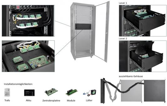 Das ARAD-S4 ist somit ideal zur Installation von Sicherheitssystemen in Serverräumen und ermöglicht eine platzsparende Integration in Standard-19"-Technik. Zur Montage in Pulsar-Schränken wie ZRSxx verwenden Sie das optionale Schienensystem ARAS.