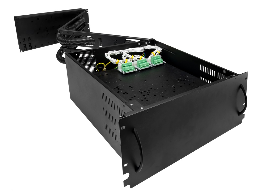 Das ARAD-S4 ist ein universelles 19"-Gehäuse für Sicherheitssysteme beispielsweise von SATEL, DSC, Risco, Paradox und vielen mehr. Alle nötigen Komponenten wie Trafo, Akku, Systemplatinen und viele weitere können in vorgefertigte Aufnahmen installiert werden. Der Schubladenauszug mit geschützter Kabelführung im Storchenschnabel erleichtern die Wartung und Installation auf engstem Raum. Zwei Installationsebenen bieten Platz für viele Platinen und Module. Die Anschlüsse sind auf das Backpanel herausgeführt, sodass bequem am Backpanel aufgelegt werden kann anstatt umständlich im Gehäuse zu verdrahten. Sämtliches Montagezubehör wie Flexschlauch, Schrauben, Kabelbinder, Storchenschnabel usw. sind im Lieferumfang enthalten. Das ARAD-S4 ist sabotageüberwacht gegen Öffnen des Deckels, Öffnen der Patch-Anschlüsse sowie gegen das Herausziehen der Schublade.