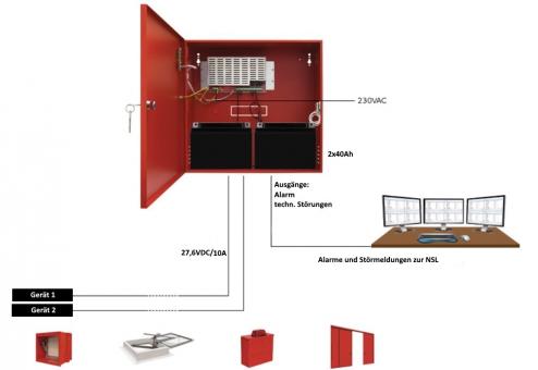 - Störungsausgänge für Akkuüberwachung, Netzspannung, Systemstörung