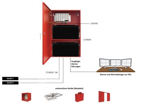 - Störungsausgänge für Akkuüberwachung, Netzspannung, Systemstörung