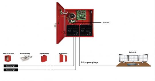 - Störungsausgänge für Akkuüberwachung, Netzspannung, Systemstörung