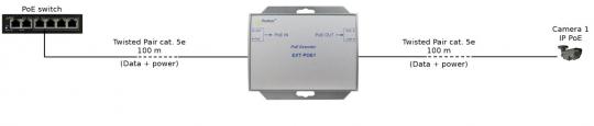 Der PoE-Extender EXT-POE1 verlängert die Reichweite einer PoE-Verbindung um zusätzliche 100 Meter. Der Ausgang ist konform zum PoE-Standard IEEE 802.3af und versorgt Endgeräte mit bis zu 15,4W. Der Extender verfügt sowohl über eine Überlastungs- als auch eine Kurzschlusssicherung. Der EXT-POE1 benötigt kein externes Netzteil, die Stromaufnahme erfolgt direkt über den PoE-Eingang.