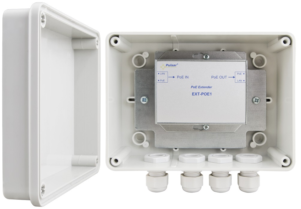 Der EXT-POE1H wird vorinstalliert in einem staub- und wassergeschützten ABS-Gehäuse (IP56) geliefert. Passende Verschraubungen und Installationsmaterial ist im Lieferumfang enthalten. Zur Mastmontage kann das passende Montageset