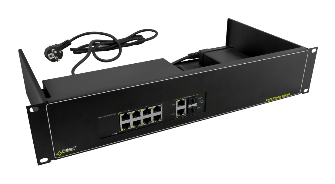 Der RSF108 ist ein 10-fach PoE+ High-Speed-Switch für den 19"-Einbau mit 2HE. Es können bis zu 8 Kameras an den Switch angeschlossen und über die PoE-Ports mit Spannung versorgt werden. Der Switch verfügt über eine automatische Erkennung des PoE/PoE+ Standards. Die Gesamtbudget für PoE beträgt 96W (max. 15,4W je Port). Der Switch hat zudem zwei Uplink-Ports mit GigaBit. Alle Ports verfügen über Auto MDI/MDIX und Auto Crossover. Montagewinkel und Netzteil sind im Lieferumfang enthalten. Die Uplink-Ports können mit den