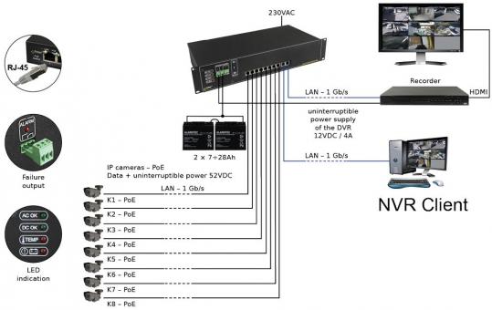 Das RSGUPS108R ist eine Komplettlösung zur Netz- und Batteriestromversorgung von 8 IP-Kameras (52V DC Stromversorgung über PoE) und unterbrechungsfreier Stromversorgung für Netzwerkrekorder (12VDC) zum Einbau in 19" Netzwerkschränke.