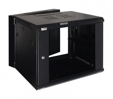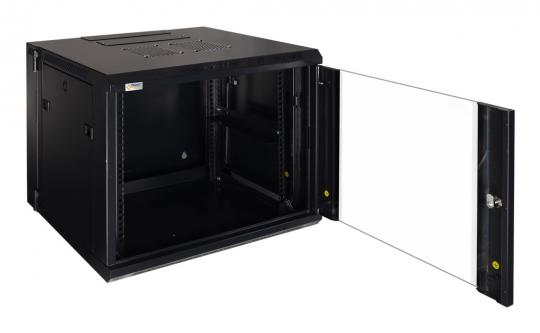 Das kompakte 19”-Hängerack RWD966GD bietet 9 Höheneinheiten für CCTV-Verteiler, Patchfelder und 19"-Infrastruktur jeder Art. Es kann für Installationen bis zu 60kg Gesamt-Dauerlast verwendet werden. Durch die Möglichkeit das Rack trotz Wandmontage beidseitig zu Öffnen ist die Installation und Wartung deutlich einfacher und komfortabler. Die hochwertige Verarbeitung und ein durchdachtes Installationsmanagement für Montagestege, Kabelhalter und Rack-Technik erleichtern die Fertigung, Erweiterung und Wartung der Systeme. Die Fronttür besteht aus 5mm gehärtetem Glas. Die Standard-Tiefe von 60cm ist der richtige Kompromiss zur bequemen Installation bei beengten Räumlichkeiten. Montagemöglichkeiten für Belüftungssysteme (RAWP und andere) sowie spezielle Belüftungsbleche an Vorder-, Unter und Oberseite schützen vor Stauhitze und erleichtern das Temperaturmanagement.