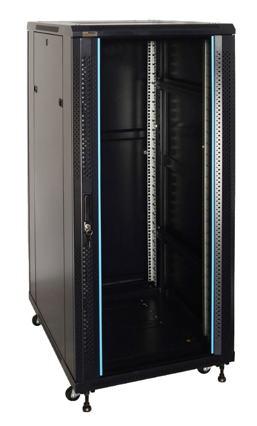 Der fahrbare 19"-Schrank ZRS2761GD bietet 27 Höheneinheiten für CCTV-Verteiler, Patchfelder und 19"-Infrastruktur jeder Art. Er lässt sich bequem über die Schwerlastrollen zum Montageort transportieren und über die beiliegenden Stellfüße fixiert werden. Die hochwertige Verarbeitung und ein durchdachtes Installationsmanagement für Montagestege, Kabelhalter und Rack-Technik erleichtern die Fertigung, Erweiterung und Wartung der Systeme. Die Fronttür besteht aus 5mm gehärtetem Glas. Zusätzlich verfügt der ZRS2761GD über zu öffnende Seitenwände. Dank der 1000mm Bautiefe können auch Einbauelemente mit großer Tiefe installiert werden. Durch den justierbaren Abstand der vorderen und hinteren Schienen ist der Schrank an die unterschiedlichste Technik anpassbar. Montagemöglichkeiten für Belüftungssysteme (RAWP und andere) sowie spezielle Belüftungsbleche an Vorder-, Unter und Oberseite schützen vor Stauhitze und erleichtern das Temperaturmanagement.
