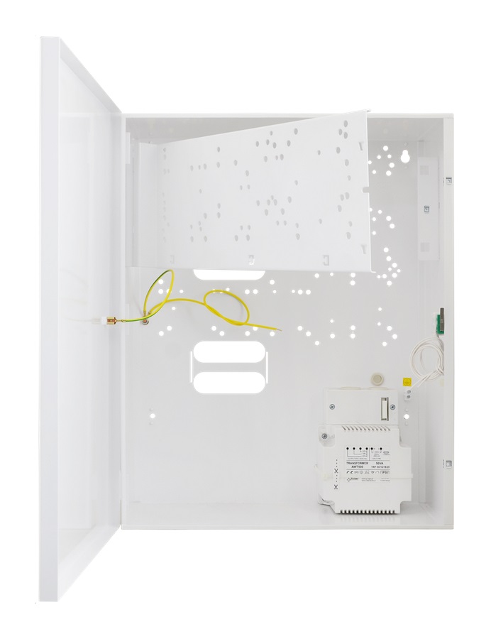Das robuste Stahlblechgehäuse AWO200K ist universell einsetzbar und kompatibel mit Technik beispielsweise von DSC, PARADOX, RISCO, SATEL, PYRONIX, CROW, TEXECOM, TELMOR, ROGER, EBS, PULSAR und einigen mehr. Als Besonderheit verfügt es über zwei Installationsebenen und bietet so viel Platz zur Montage der Technik. Die zweite Ebene kann zu Wartungszwecken seitlich weggeklappt werden. Es ist öffnungsüberwacht und besitzt einen 50 VAC Transformator mit 16V-, 18V- sowie 20V-Abgriff. In dem Gehäuse ist Platz für die Hauptplatine der Zentrale, Erweiterungsmodule und 17 Ah Akkumulator. Das Gehäuse vefügt bereits über die passenden Bohrungen um die unterschiedlichen Module möglichst einfach installieren zu können. Eine Vorstanzung im Frontblech ermöglicht die bequeme Nachrüstung eines Schlosses.