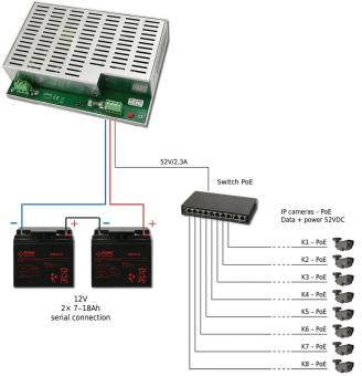 stabilisierte Spannung von 52 VDC (z. B. PoE-Powersysteme, PoE-Switches). Diese Lösung hat einen zusätzlichen Vorteil in Form von Stabilisierung der Ausgangsspannung unabhängig vom Ladezustand der Batterie. Der eingebaute DC/DC-Wandler ermöglicht eine Kostenreduzierung der Installation durch Reduzierung der Anzahl der benötigten Batterien. Ein zusätzlicher Vorteil ist die Stabilisierung der Ausgangsspannung unabhängig davon Ladezustand des Akkus. Das Netzteil verfügt über einen sehr breiten Spannungsversorgungsbereich von 200-240 VAC.