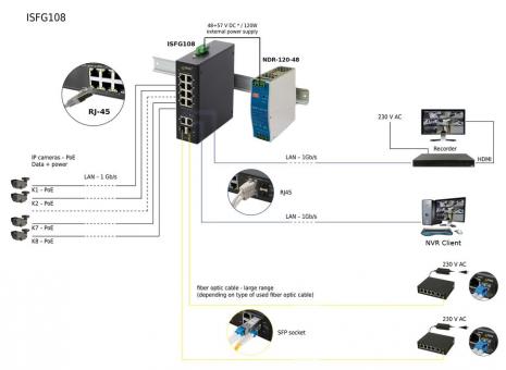 Der ISFG108 ist ein 10-fach PoE+ Switch für Hutschienenmontage ohne Netzteil. Es können bis zu 8 Kameras an den Switch angeschlossen und über die PoE-Ports mit Spannung versorgt werden. Der Switch verfügt über eine automatische Erkennung des PoE/PoE+ Standards. Das Gesamtbudget für PoE beträgt 120W (max. 30W je Port). Der Switch hat zudem zwei SFP-Uplink-Ports mit ebenfalls GigaBit-Anbindung. Alle Ports verfügen über Auto MDI/MDIX und Auto Crossover.