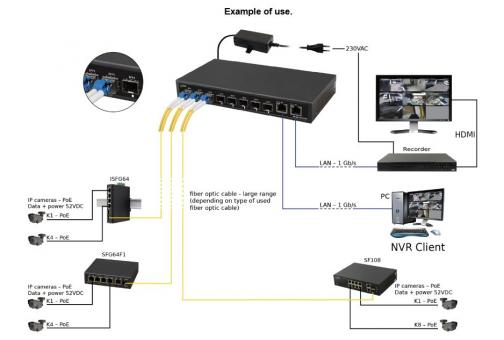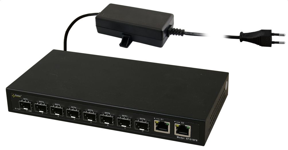 Der SFG10F8 ist ein 8-fach LWL-Gigabit-Switch. Es können bis zu 8 LWL-Strecken an den Switch angeschlossen werden. Der Switch hat zudem zwei RJ45-Uplink-Ports mit ebenfalls GigaBit-Anbindung.
