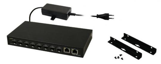 Montagewinkel und Netzteil sind im Lieferumfang enthalten. Die LWL-Ports können mit den GBIC-SFP-Modulen auch mit anderen LWL-Installationen angebunden werden.