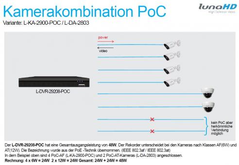 Die Spannungsversorgung erfolgt über 12VDC oder über PoC (Power over Coax) auch direkt über das Kabel (bis zu 400m Reichweite). Eine PoC-Einspeisung durch z.B. Rekorder wird benötigt.