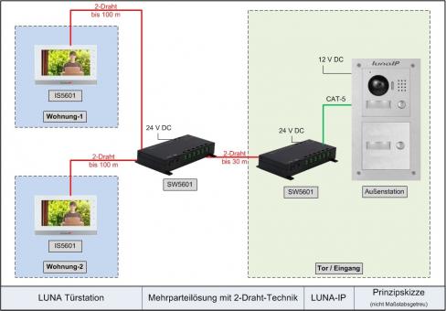 Sie dient zur Anzeige des Videobildes und dem Gegensprechen mit der Türstation. Zusätzlich besteht die Möglichkeit eine Tür über die Basistation zu öffnen. Die Kommunikation von der Außenstation zum Spezialswitch SW5601 erfolgt über das Netzwerk (IP). Das Display wird über 2-Draht an den Spezialswitch angeschlossen. Dadurch kann meist eine aufwändige Neuverkabelung eingespart werden.