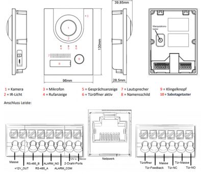 - RS485 z.B. für ER5020, 12 V out/100 mA und Relaisausgang/300 mA (für Türöffnerkontakt, falls verwendet)
