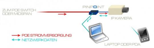 Der Pinpoint-Adapter ermöglicht es dem Errichter die IP-Kamera (PoE) mit deutlich weniger Arbeitsaufwand einzurichten. Der Pinpoint-Adapter wird einfach in die Netzwerkstrecke an der Kamera angeschlossen und ermöglicht so das parallele Betrachten des Kamerabildes am Laptop während der normale Betrieb der Kamera bestehen bleibt, auch bei Stromversorgung der Kamera über PoE.