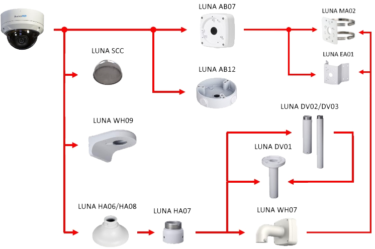 Die LUNA DA2200 ist eine vandalismusgeschützte (IK10) HD Multiformat Dome-Kamera mit IR-Strahler bis 40 m (HD-CVI/TVI/AHD/CVBS umschaltbar über DIP Schalter an der Kabelpeitsche). Sie ist für den Innen- und Außeneinsatz geeignet (IP67). HD-CVI ist ein Standard zur Langstreckenübertragung (max. 500 m) von HD-Videobildern (720p, 1080p) über konventionelle Koax-Kabel. Neben dem Video können auch Audiosignale (modellabhängig) und Daten über das gleiche Kabel übertragen werden. Der CMOS-Sensor liefert eine max. Auflösung von 2 Megapixel (1920 x 1080 px) mit bis zu 25 Bilder pro Sekunde. Die Kamera ist mit einem 3,6 mm Objektiv ausgestattet und verfügt über einen mechanischen IR Cut Filter (ICR). Einstellungen an der Kamera können komfortabel über das Koaxialkabel im OSD (OnScreenDisplay) der Kamera vorgenommen werden. Die Spannungsversorgung erfolgt über 12 V DC.