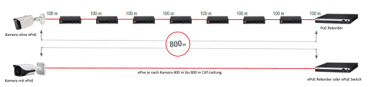 ePoE bedeutet - extended Power over Ethernet. Diese Technologie überträgt das Videosignal, das Audiosignal, die Steuerdaten und die Stromversorgung für eine ePoE fähige Kamera auf einer Länge von bis zu 400/800 Metern (je nach Kamera). Bei der klassischen PoE-Technik wird nach einer Länge von 100 Metern ein Netzwerkswitch oder ein PoE-Extender benötigt. Durch ePoE enstehen weniger Installation- und Wartungskosten.